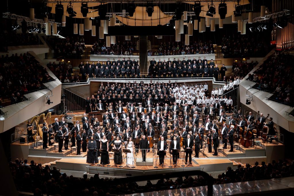 Du point de vue des solistes. Il faut noter que brèves ou longues, les interventions sont particulièrement difficiles et que les voix dans la Philharmonie ne sonnent pas de la même manière selon la place où l’on se trouve, mais le sentiment de l’universel est donné par d’abord ces solistes alignés venus des coins les plus divers (Europe, Asie, Amérique, Afrique), illustration d’une humanité unie dans sa diversité en Mahler et Goethe. Il reste des universaux culturels, loin d’ailleurs d’être tous européens, bien heureusement.