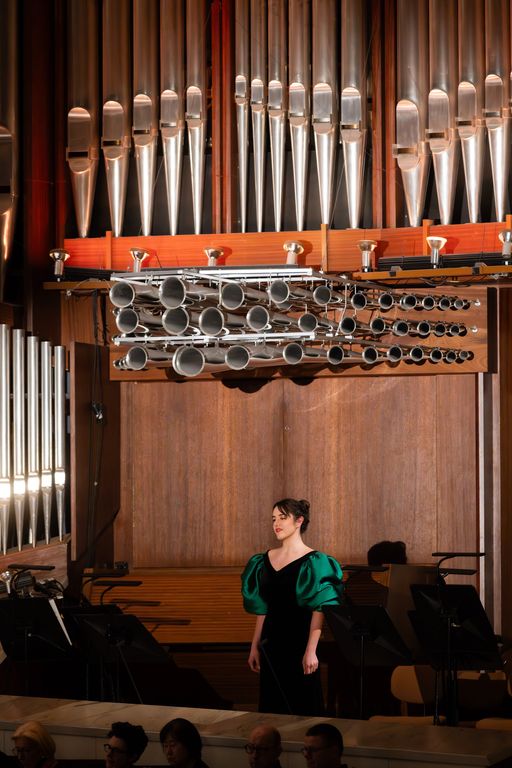 Enfin Jasmin Delfs du haut du podium de l’orgue semblait moins à l’aise qu’elle ne l’était à Munich ou de la loge royale, elle nous avait fortement impressionné en Mater gloriosa. Ici la voix se font un peu dans l’ensemble et n’arrive pas peut-être à nous saisir comme elle nous avait saisi naguère. Peut-être est-ce une difficulté passagère ou peut-être est-ce aussi l’acoustique qui ne lui est pas favorable.