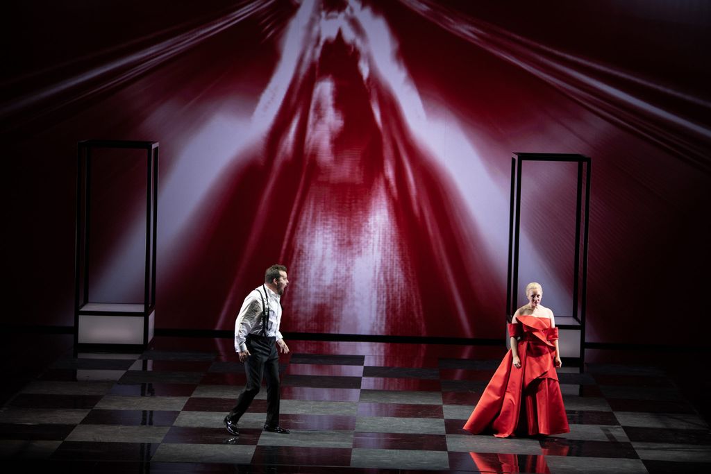 This is the ball scene, with ballet music treated in a very playful way by Netia Jones, like a game of chess (they are all losers) where the guests enjoy playing the pieces on a chessboard. It is therefore a social game, with its precise rules and precise movements (we find the effects of symmetry from the world below). There is less wriggling than with the nymphets, but it is more fun. The reds face off against the blacks. The foreign Princess is passionate red, of course, while the Prince in his tuxedo is both black and Rusalka, in a puffy white dress, a real meringue, an extra piece in this well-oiled game. Rusalka, too ethereal, cannot satisfy the Prince's carnal desires, and he rejects her and is rejected by the Foreign Princess, who is too jealous.