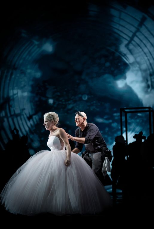 Here, we see a video of an ascent to the surface reminiscent of that of Bill Viola, master of ritual and transcendence imagery, for Sellars' production of Tristan und Isolde at the Opéra-Bastille and elsewhere. Other images by another visual artist follow, as Netia Jones uses carefully chosen lighting to transform the stage into the icy world of Robert Wilson : sharp, cold lights and varied shadows.