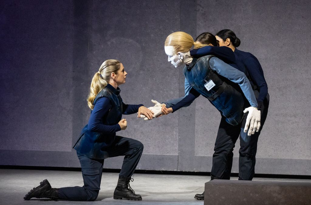 The in-depth look at the characters and their relationships, and the rather sharp eye on the libretto, were more or less convincing up to this point, but as soon as Fidelio appears on stage, with four people, a puppet operated by two puppeteers and the singer, something shifts and creates unease. Not that the puppet is poorly made – quite the contrary, Nikolaus Habjan is a master of the genre, and puppet maker Bruno Belil has succeeded in creating impressive figures – but what is disturbing is the ‘mechanical’ aspect. The puppet is there to show that there are two sides to the character of Leonore : two characters : the one that others see, namely Fidelio, and the one she really is, namely Leonore, and that what she sings is who she is. Fidelio does not exist, he is an appearance, but the (only) puppet that the other characters are supposed to see is transformed for the audience into four people who move heavily, including the singer, who does not always seem to know what she is supposed to do or even what she is doing there.