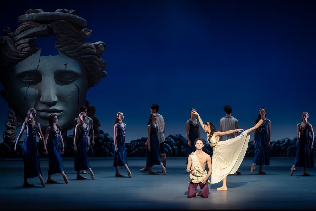 Callirhoe herself emerges as a modern tragic figure : subjected to divine caprice and male violence, yet never broken. Her lyrical solos radiate an almost supernatural inner strength, while the lifts emphasise vulnerability without diminishing her authority. Cassandra Trenary embodies the role with poignant elegance, her arms flowing with remarkable fluidity and her footwork softened to near weightlessness. Her expressive range is deep and musical, animating every gesture. Opposite her, António Casalinho offers an irresistibly charged Chaereas. His immaculate technique — polished, buoyant, seemingly effortless — was already well known ; here it is joined by a compelling dramatic instinct and a raw, youthful energy that propels the character from charming impetuosity to vengeful fury. His explosive jumps and blazing manèges electrify the battle scenes without tipping into display, yet he is equally capable of finely shaded tenderness in his duets with Trenary, with whom he shares a striking physical and emotional rapport.