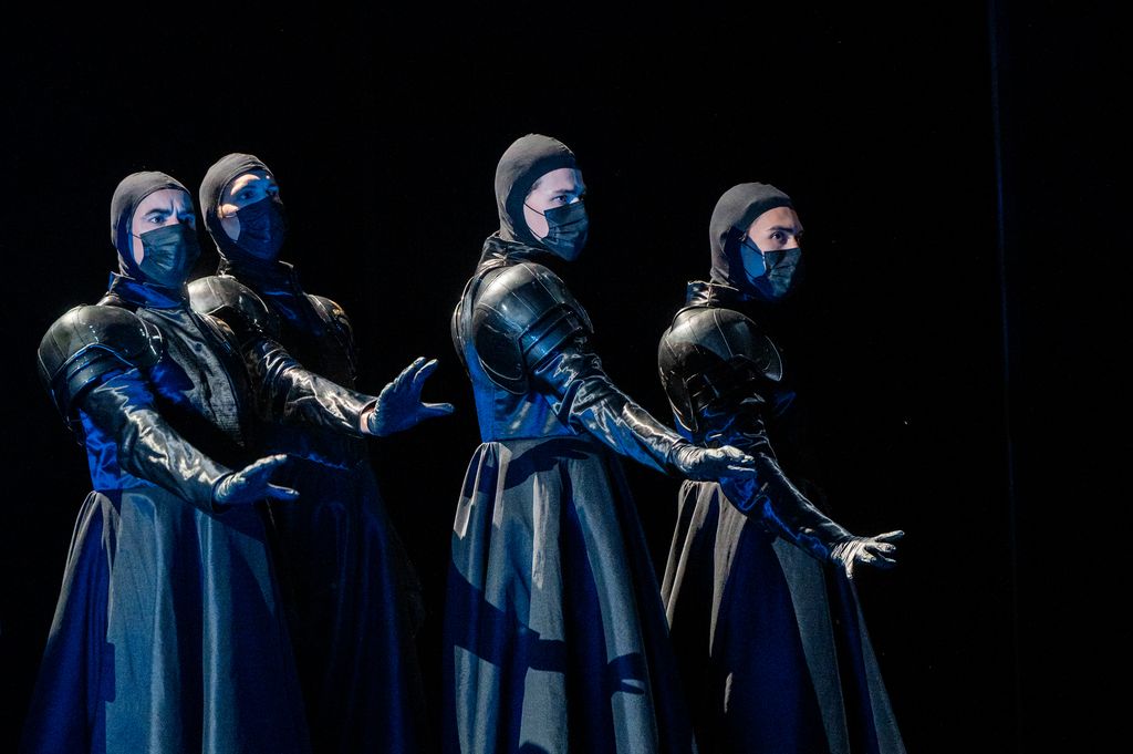 La presenza dei ‘cattivi’ è praticamente permanente nella messa in scena, ombre nere spettrali nascoste dietro le pareti, figure pronte al crimine, pronte a tutto, che sorvegliano tutto, mettendo i “buoni” in libertà vigilata permanente. Sono vestiti di nero, è ovviamente la morte che si aggira e che è pronta a colpire.