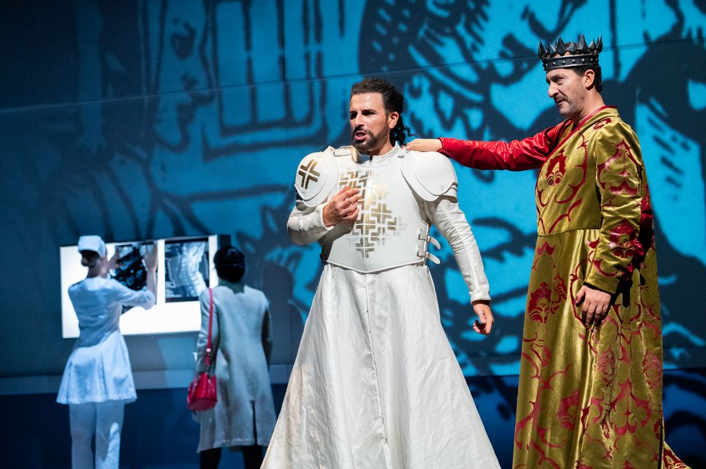 Non discuto la scelta del “pitch”, ma la sua realizzazione, confusa e che si è scontrata visibilmente con un libretto che non si lasciava fare. In questo tipo di approccio, la leggibilità deve essere immediata, le corrispondenze tra presente e passato fluide e la scelta drammaturgica non deve oscillare tra due o tre acque, perché il libretto a volte permette l'inserimento della storia che si vuole raccontare e a volte molto meno. Ci si dice allora che se si fosse lasciato la regina navigare nel suo Rinascimento donizettiano, con bei costumi e in un allestimento tradizionale, si sarebbe gridato al conformismo forse, alla tradizione polverosa senza dubbio, ma non all'assurdità. Quando si vede Giacomo Lusignano ergersi come un malato molto XXI secolo circondato dal personale sanitario, e in lontananza il coro rinascimentale, è difficile trattenere un sorriso, se non una risata.