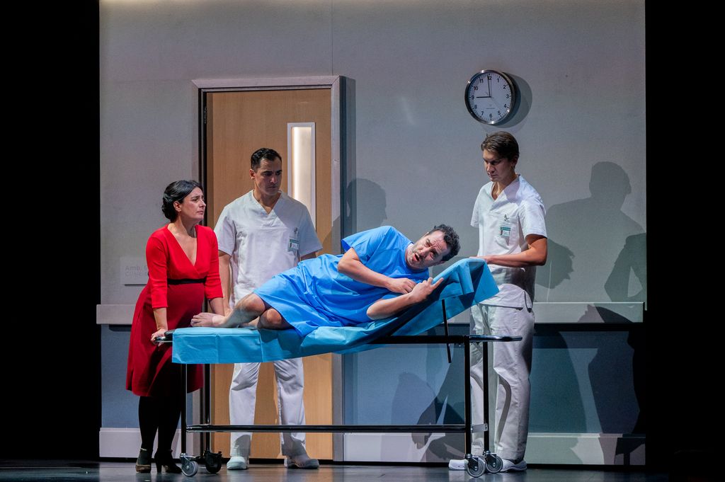 Così Gerardo, il tenore innamorato, diventa il chirurgo, disperato per non riuscire a salvare Giacomo, e le armi con cui si combatte sono siringhe o bisturi.