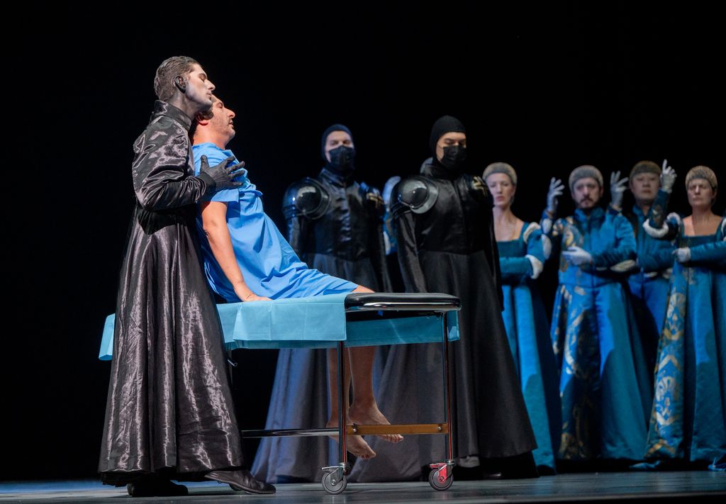 Così che ci si trova il più delle volte in un'opera tradizionale con costumi molto belli (di Alessio Rosati), concepiti per evocare una Venezia da sogno, una sorta di Rinascimento pittorico che trascende ogni realtà, movimenti scenici convenzionali, il tutto interrotto di tanto in tanto da immagini di ospedali, infermieri o medici (per la parte contemporanea) e proiezioni di dipinti rinascimentali (per la parte “storica”) che rappresentano in particolare immagini del sacrificio cristico, con luci assai belle di Alessandro Andreoli.
