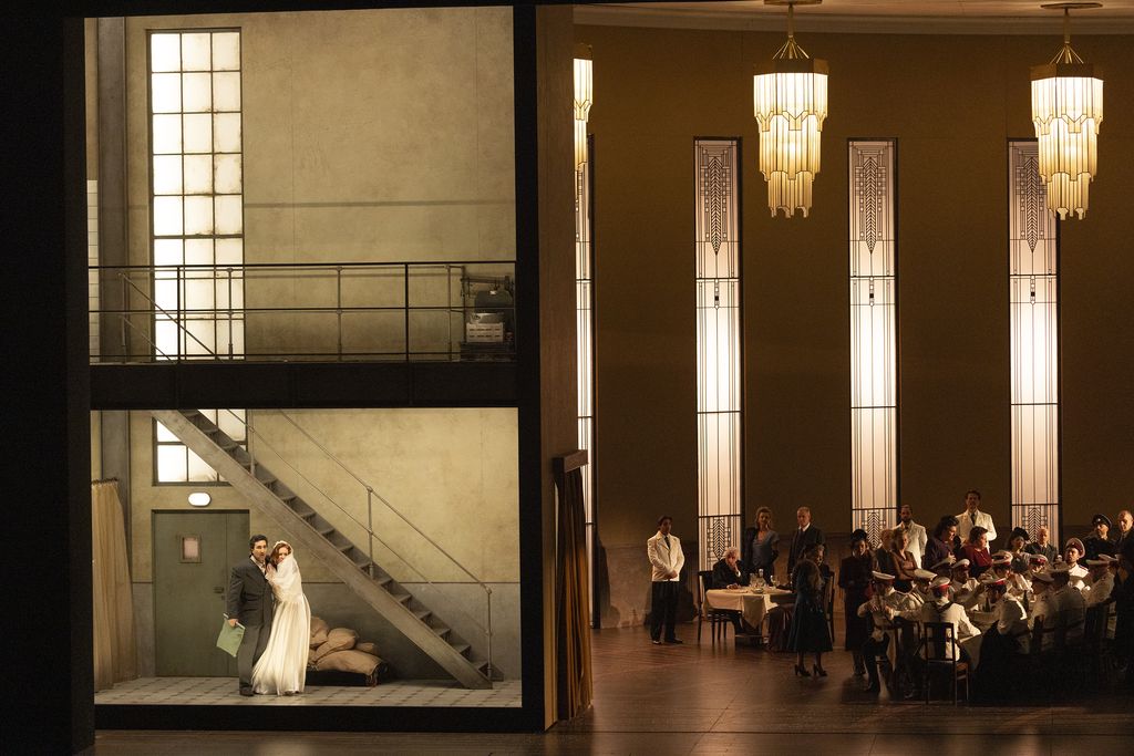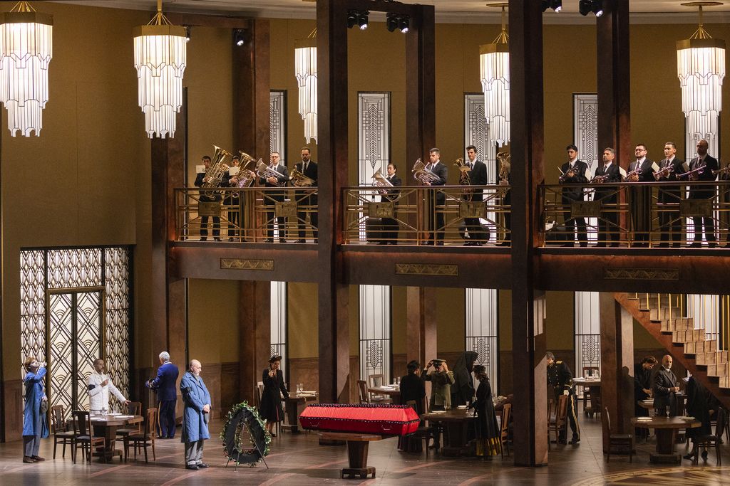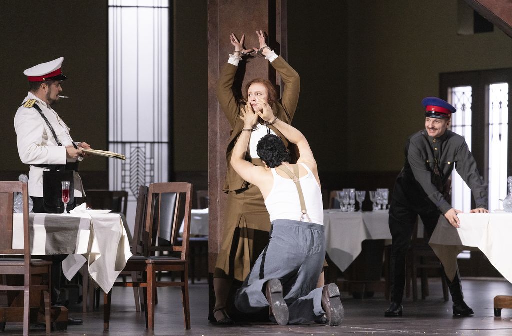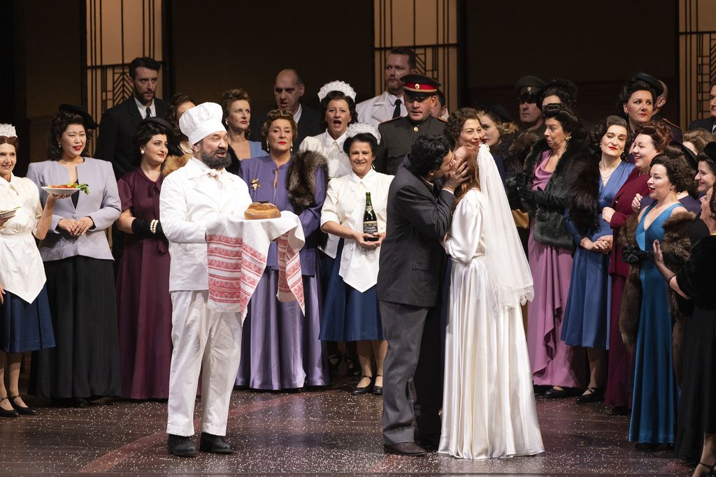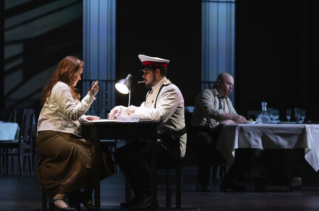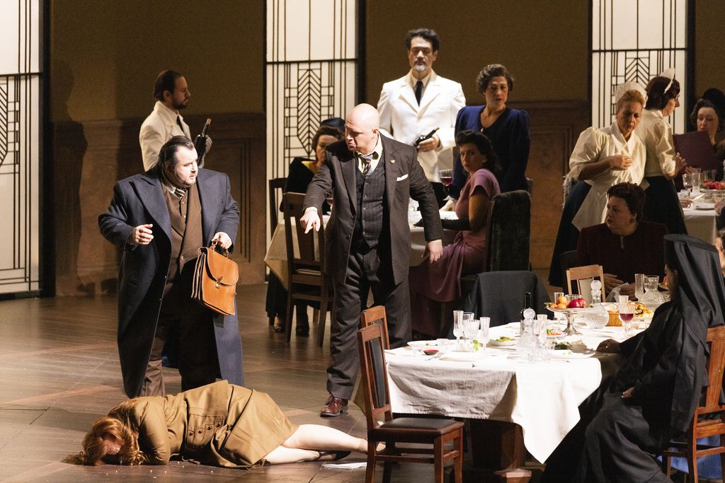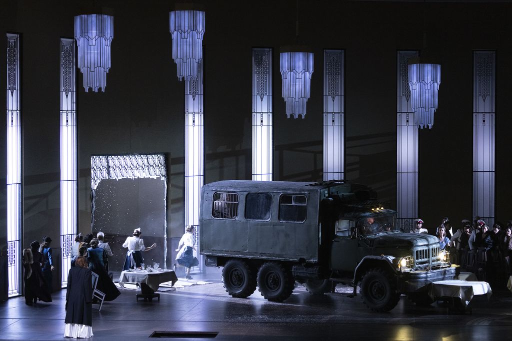Ma Vasily Barkhatov ha creato questa scenografia fissa di sala da pranzo, al quale ha saputo aggiungere alcune pareti di prigione o di retrocucina che appaiono e scompaiono. O lascia questo set, o lo fa scomparire con il rischio di rinunciare a ciò che costituisce l'unità stilistica ed estetica della sua produzione.