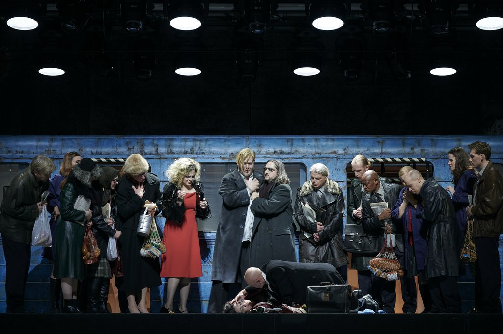 Alexandra Szemerédy et Magdolna Parditka vont donc construire un imaginaire plus contemporain où si le mariage est le monde « du dessus », toute la trame se passe dans le monde « du dessous », une sorte de monde infernal symbolisé dans leur décor (elles assument mise en scène, décors et costumes) par celui du métro, où règne une vie souterraine dédiée aux « mobilités » comme on dit aujourd’hui, mais aussi grouillant d’autres vies, SDF, magasins, graffitis. Et, dans la réalité de cette Kiev d’aujourd’hui où se déroule cette histoire d’hier, le métro est aussi abri contre les bombardements, voire école, voire installation provisoire de réfugiés avec lits dans les stations ou les wagons : c’est un aspect qu’elles n’abordent pas mais auquel on pense, inévitablement. Le métro est donc un monde, et elles vont en exploiter toutes les possibilités, un peu comme le fit Luc Besson dans son film Subway en 1985.