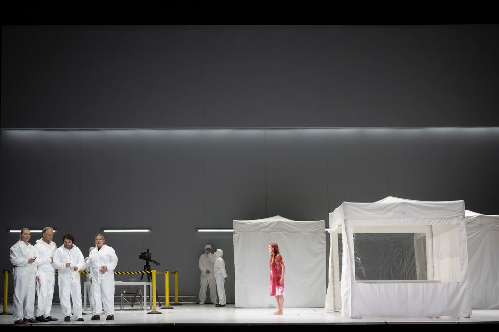 Le deuxième don, qui est la deuxième station de la Peri devant les secousses du monde, l’amène au cœur d’une épidémie épouvantable. La scène se remplit de « barnums » bien connus au moment de l’épidémie de Covid. Et ici Kratzer offre une vision directe du vécu de tous les spectateurs. La première partie était un vécu par la médiation des médias, des bruits de la guerre sans qu’elle ne touche directement le spectateur par un effet de réalité, la deuxième est encore une plaie ouverte dans le vécu de toutes les sociétés, dont les sociétés européennes. Le lien est fait immédiatement. Et la scène devient si éclairée qu’elle contraint à fermer les yeux devant une lumière si aveuglante, comme un mal qui court et qui te contraint à fermer ou détourner les yeux. Comme si le spectateur était exclu lui-même du spectacle.