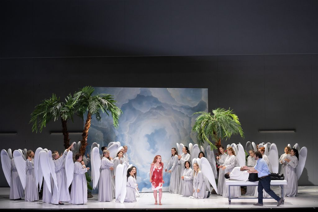C’est pour souligner cette universalité qu’il a besoin d’englober le public dans son propos. Le laisser spectateur-regardeur formidable du monde, c’est mentir : les guerres, c’est nous, les épidémies, c’est nous, la compassion, c’est nous. Certes, Aristote a théorisé la catharsis, mais Kratzer veut aller plus loin pour montrer que ce que dit et raconte l’oratorio n’est pas un conte oriental et lointain, mais l’éternel recommencement de notre histoire, de nos souffrances, de nos fautes très humaines. Et du même coup, le paradis doit apparaître un paradis artificiel (sans parodier Baudelaire, ni lui donner le même sens), il doit apparaître comme une représentation vaguement enfantine, vaguement ridicule, de nos rêves de paradis, des anges plus anges que nature, des palmiers, des ciels « célestes » au bleu pictural des ciels de Tiepolo : il fait tout pour que ce paradis-là soit « scénique », presque une caricature d’opéra à quat’sous, de mauvais opéra de province, si bien qu’à voir ces anges avec leurs ailes de plastique qui bougent, on ne peut esquisser qu’un sourire, parce qu’évidemment on ne peut y croire, on n’y croit pas : c’est fait pour ça.