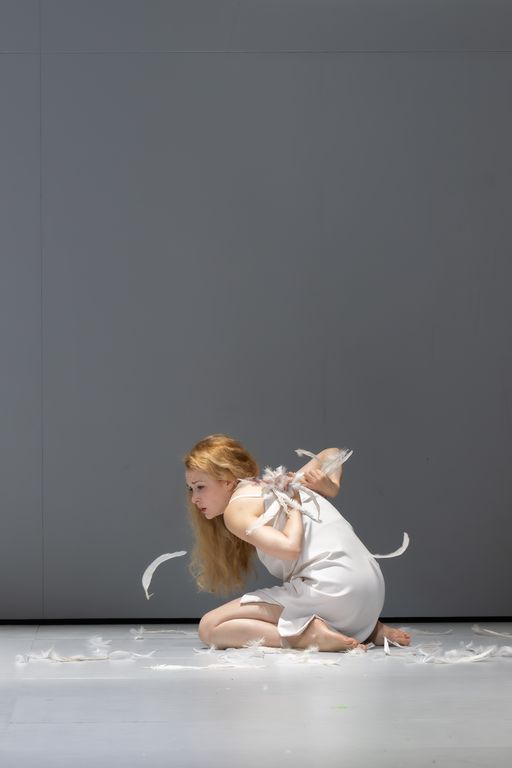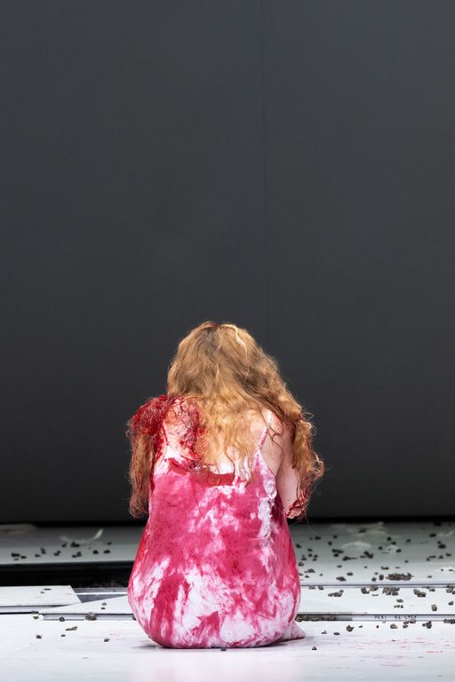 Kratzer n’a pas besoin de transposer le monde de la guerre puisqu’elle est à nos portes, que ce soit en Ukraine ou au Proche Orient. La vision de la guerre est d’une actualité éternelle, tout comme celle du tyran, mais aussi celle du résistant qui meurt pour ses idéaux. C’est ainsi celle du jeune héros qui donne sa vie et son sang pour sa liberté et la fin de la tyrannie. Ce don-là de la Peri est nécessaire, mais sans doute pas suffisant. C’est le signe que la Peri est « du bon côté », mais elle est encore spectatrice de l’horreur du monde et en même temps, Kratzer la représente comme une sorte de « pharmakos », de réceptacle de ce que les autres n’osent (ou ne veulent pas) faire, et qui la badigeonnent de sang. On va jusqu’à lui verser un seau de sang sur la tête (comme Marie dans Die Soldaten signés Bieito, ou Tannhäuser – qui se le verse lui-même – plus récemment dans la vision de Michael Thalheimer à Genève). La Peri devient ainsi une sorte d’exclue.