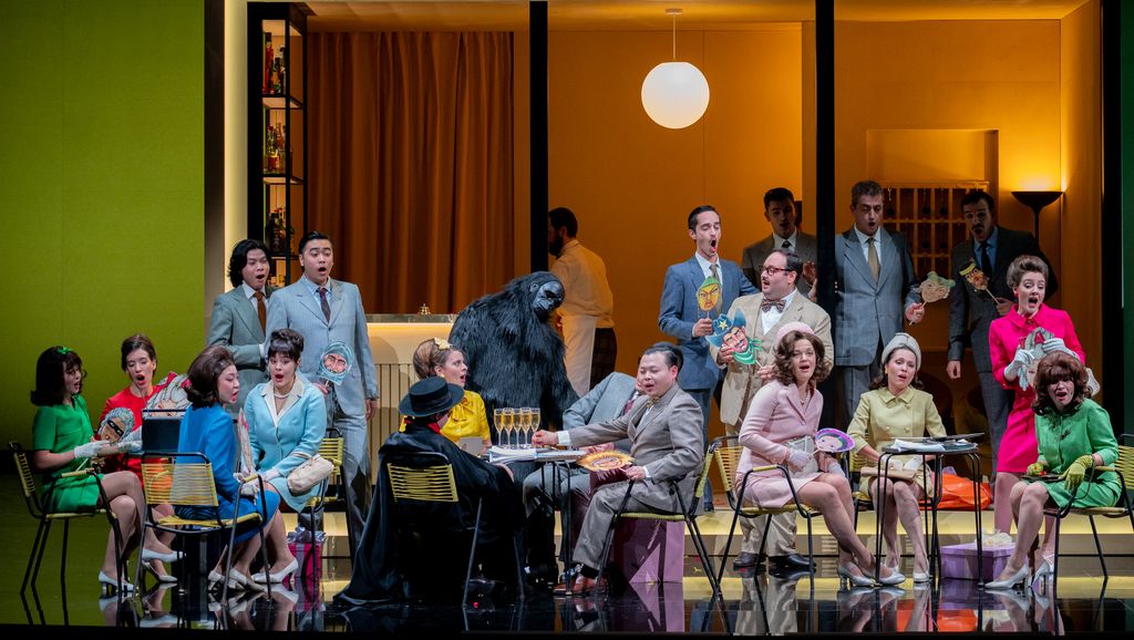 Je précise d’emblée que c’est une équipe féminine, dirigée par Stefania Bonfadelli, qui a produit le spectacle, avec les costumes très frais, très colorés, très ensoleillés, très années 1960–70 et assez élégants de Valeria Donata Bettella qui font beaucoup pour l’ambiance de la soirée et qui renvoient au monde des comédies italiennes à la Dino Risi, ou des films à sketches qu’on a tellement aimés comme Les Monstres ou Les nouveaux Monstres, le tout les lumières flashy de Fiammetta Baldisseri.