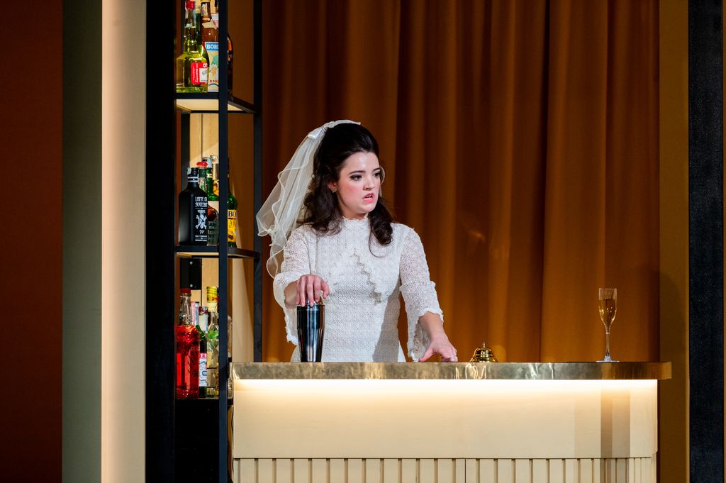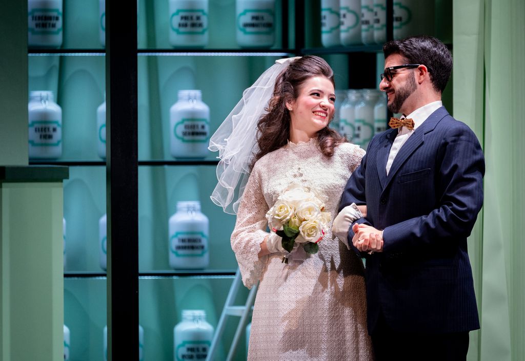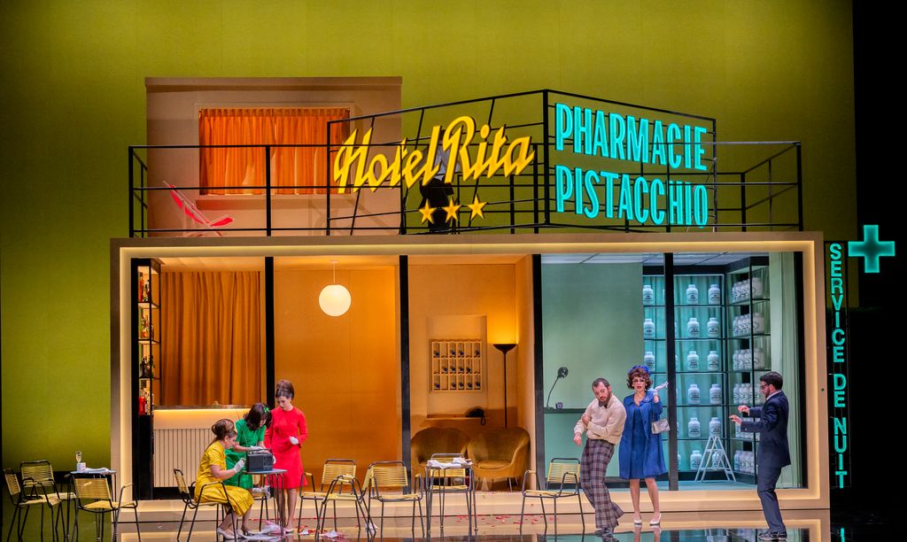 Comme nous venons de le préciser, le spectacle composé de deux œuvres a été grosso modo scénarisé pour en faire deux tranches de la vie de couple, dans un décor unique, signé Serena Rocco, de deux négoces mitoyens d’une rue imaginaire. Une pharmacie pour « Il campanello », un hôtel-restaurant dans le cas de « Deux hommes et une femme ». Deux tranches de vie de couple, ou plutôt deux tranches de vie de femme, que nous avons résumé lestement « L’amour et la vie d’une femme », dans la mesure où dans le premier opéra, la femme est jeune mariée la nuit de ses noces, et dans l’autre, après avoir perdu un premier mari qui la battait, elle se venge en maltraitant le second. L’une s’ouvre à l’amour et à la vie de couple – on verra comment – et l’autre, déjà trop bien instruite, a modifié en conséquence ses règles de vie.
