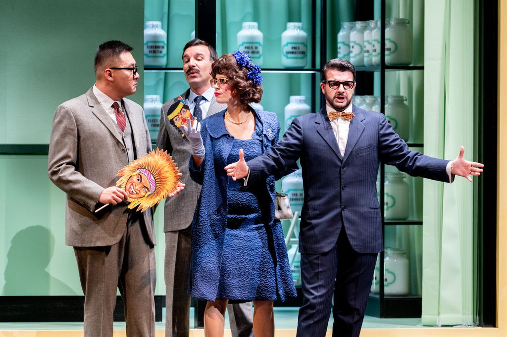 Pierpaolo Martella, lui aussi baryton (les deux rivaux sont barytons), est remarquable dans le rôle du pharmacien Annibale Pistacchio, le cocu pas très magnifique. La voix est parfaitement posée, d’une grande solidité technique, avec un timbre velouté et chaleureux, des aigus maîtrisés et un vrai style. Le personnage est parfaitement dessiné, assez jeune et plongé dans ses pots d’apothicaire, et considérant sa femme d’une manière un peu… distante. Il allie un chant maîtrisé au service d’un véritable aplomb scénique, il est un « personnage », moins histrionique que Enrico, mais d’une solidité qui frappe les spectateurs et étonnante pour un chanteur aussi jeune.
