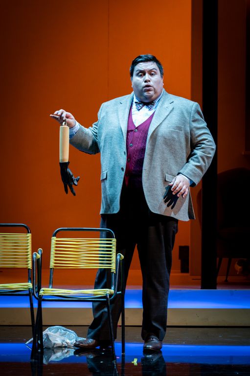 Cristóbal Campos Marin, originaire du Chili, en Pepé possède lui aussi de vraies qualités et vocales et scéniques. Vocalement, même si le français n’est pas totalement maîtrisé, il est très acceptable. Il possède une élégance réelle dans la manière d’aborder le chant donizettien, et surtout sait travailler le mot, les variations de couleur avec une vraie délicatesse. La voix de ténor est bien projetée, assez forte, et domine aussi bien les couleurs lyriques que les aspects bouffes, avec un souci du travail sur les modulations de chaque parole, de chaque phrase musicale. Mais il sait surtout allier cette délicatesse vocale et cette expressivité avec une aisance scénique que son physique robuste ne laisse pas deviner. Il emporte la salle dans un délire comique quand il se met à danser avec une souplesse et une aisance qui sont à la fois désopilantes et complètement maîtrisées. Voilà un jeune ténor capable d’un chant qui sait émouvoir, qui sait aussi faire rire ou sourire, totalement convaincant à tous niveaux, jouant parfaitement le naïf obéissant et le mari reprenant du poil de la bête. Étonnant.