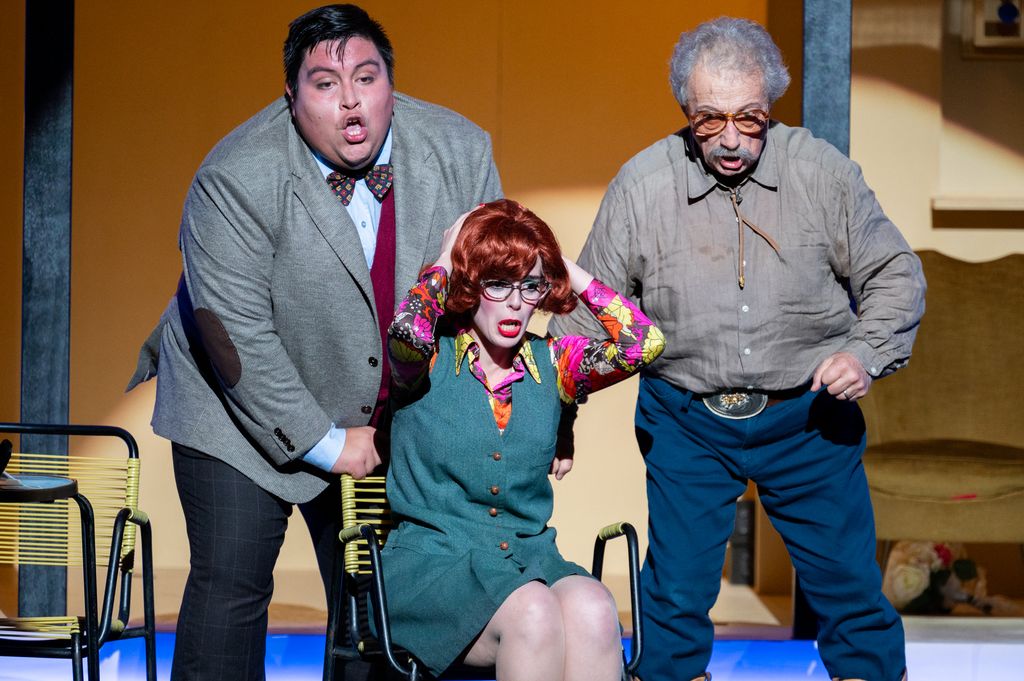 Compte tenu de « l’interopérabilité » des deux œuvres dans cette mise en scène, le spectateur peut-être ne le ressent que de manière fugace, mais Deux hommes et une femme repose sur trois personnages seulement : c’est un dialogue vaudevillesque très serré (en français), avec des jeux de mots, quelques doubles sens, qui effectivement fait penser par moments à Feydeau. Il Campanello possède quatre personnages (cinq si l’on compte Spiridione, qui apparaît fugacement dans la seconde pièce par le jeu de la mise en scène), mais avec le chœur, et donc un peu plus spectaculaire.