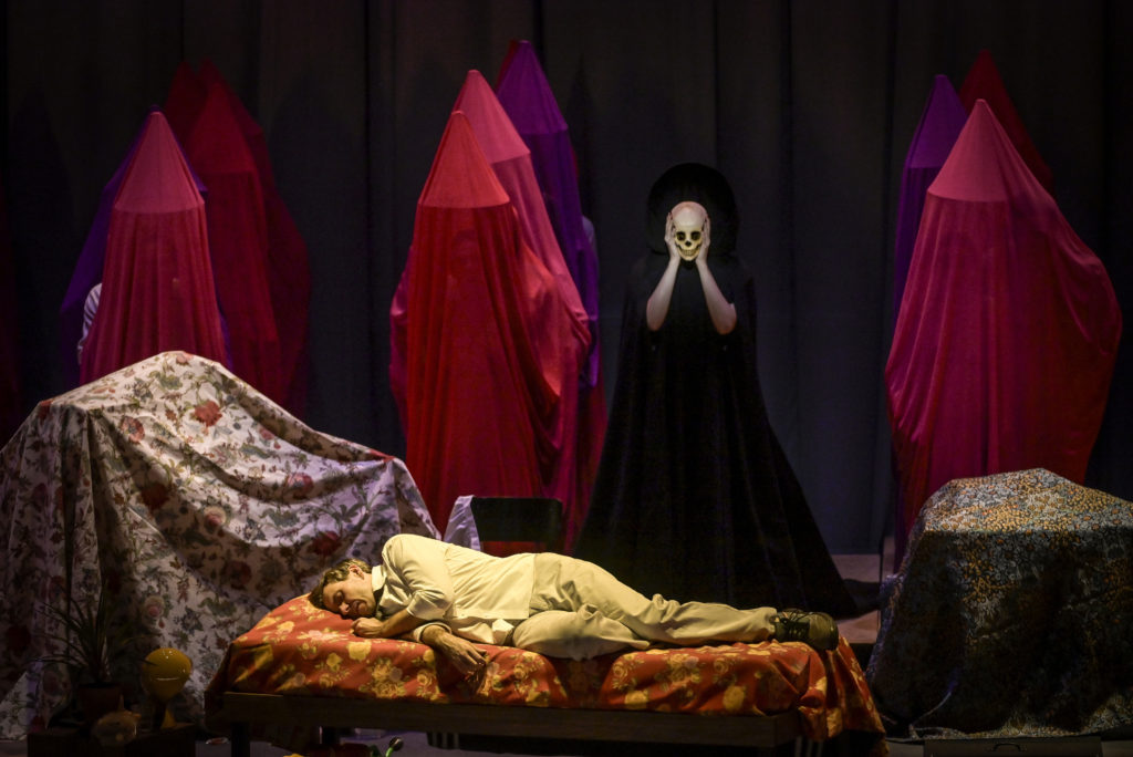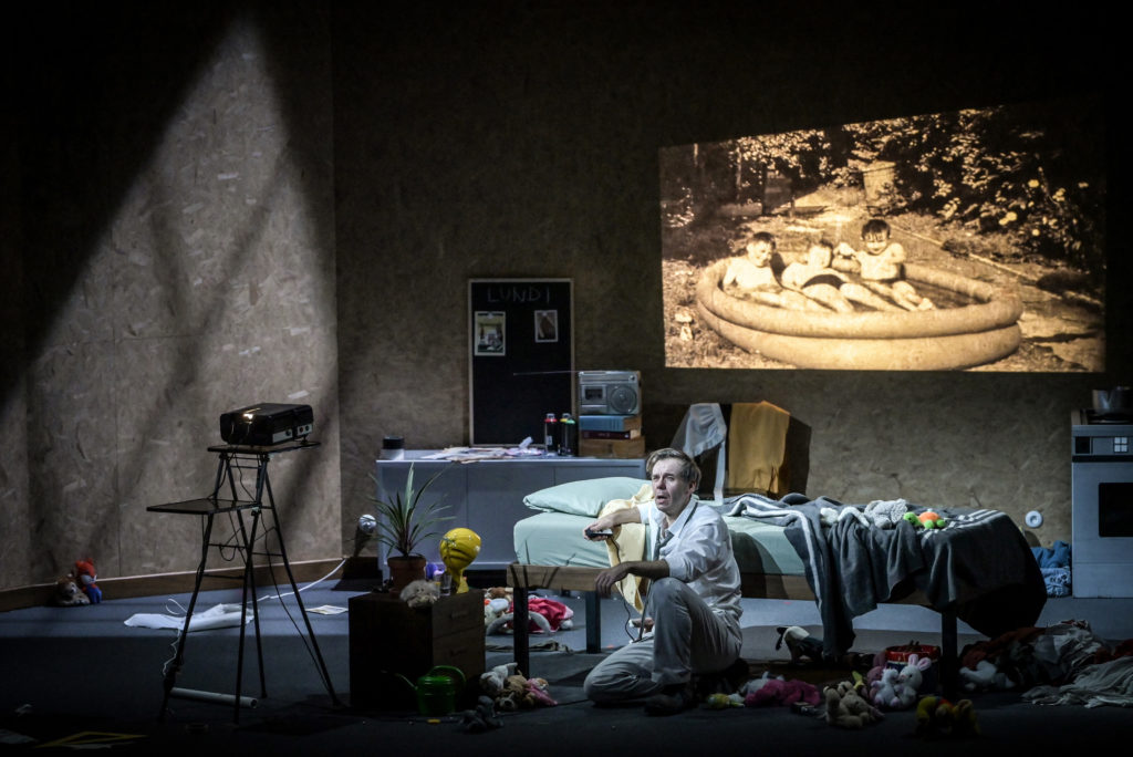 La solution ambitionnée par Silvia Costa consiste à aborder La Damnation de Faust en partant d'un principe : si l'œuvre de Berlioz résiste au théâtre narratif traditionnel, autant en épouser la logique de visions fragmentées, de réminiscences et de surgissements mentaux. Sa lecture se concentre donc sur l'espace intérieur du protagoniste, sur son repli et notamment, sur la persistance de l'enfance comme refuge et comme trauma. La première partie installe ainsi le public dans la chambre de Faust, un espace réaliste dans son mobilier – lit défait, table de chevet encombrée, vieux magnétophone, affaires d'écolier – mais saturé d'objets enfantins qui dérèglent l'ensemble. Peluches et doudous multicolores envahissent la pièce jusqu'à recouvrir Faust endormi, comme si le personnage dormait littéralement sous le poids de son enfance. Plantes en plastique, jouets, ballon gonflable, projections d'images d'un album de famille : tout suggère un adulte qui refuse de grandir, comme figé à l'âge où le monde rassure encore. L'on comprend ce que Costa cherche à matérialiser : le cocon mental dans lequel Faust s'est enfermé, griffonnant à la va-vite de mystérieuses esquisses avec un casque anti-bruit sur les oreilles, ou bien lové dans ce ventre de peluches protecteur mais oppressant, métaphore intuitive de son impossibilité d'accéder au réel autrement que par la rêverie. La présence d'un crâne posé à l'avant-scène forme à la fois un discret souvenir d'une nuit de Walpurgis, ou clin d'œil involontaire (?) à Olivier Py – introduit timidement l'idée du rituel et du fantastique, comme si le cauchemar pouvait à tout moment basculer.