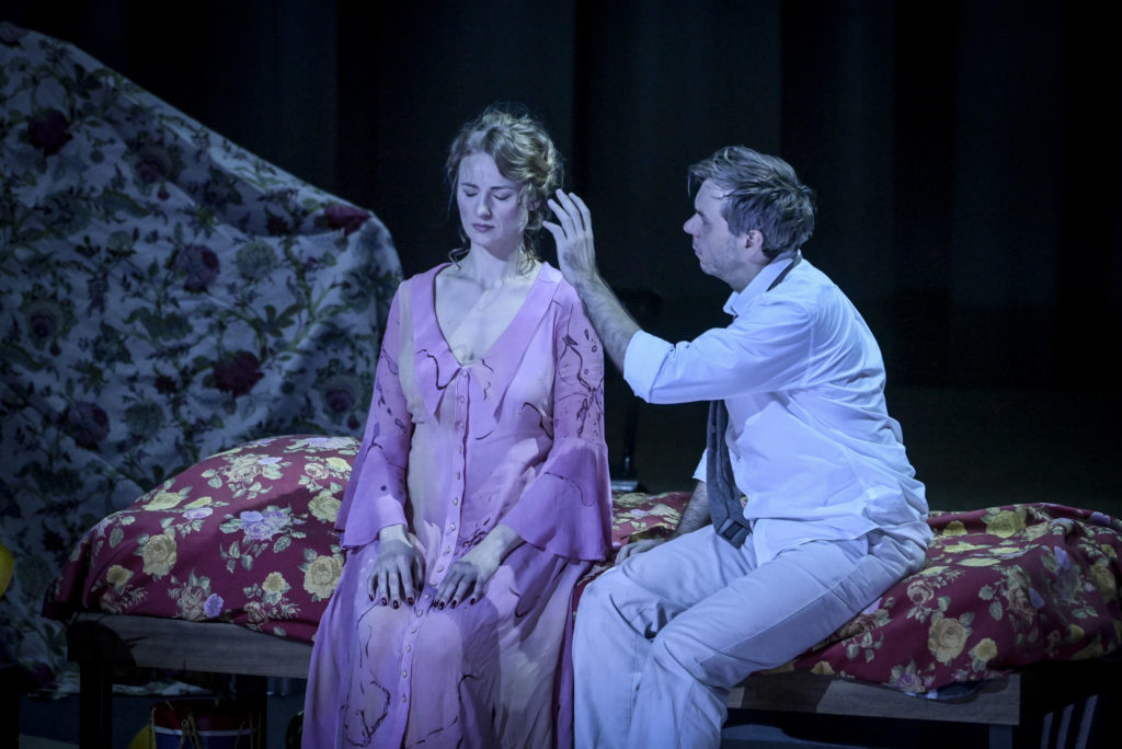 Dans les faits, pourtant, cette somme d'idées peine à se transformer en véritable vision, et l'on reste très vite au seuil du théâtre. La chambre d'enfant, après une première impression efficace, devient un cadre unique qui étouffe au lieu de libérer l'imaginaire. Tout s'y déroule – taverne d'Auerbach comprise, réduite à un jeu d'enfants sur un tapis fleuri – sans que la scénographie ne se renouvelle ni ne trouve d'équivalent scénique à la diversité des climats musicaux. L'effet des peluches, d'abord quasi freudien, tourne au gag involontaire ; Faust manipule ses doudous comme autant de signifiants mous, et la symbolique appuyée finit par retirer toute force à l'image initiale. Le motif de l'enfance se décline lourdement, à l'image de Brander surgissant, entouré d'enfants affublés de fausses calvities et de sourcils postiches, comme si le concept prenait le pas sur toute nécessité dramatique. Même lors de la rencontre de Faust et Marguerite, rien ne vibre : elle surgit d'une couverture comme un spectre sombre et silencieux, figure plus fantomatique que charnelle, et assise sur le lit tandis que Faust passe une partie de la scène caché en dessous. L'amour, l'abandon, la transgression – tout ce qui devrait brûler ici – demeure en friche, comme retenu derrière un voile symbolique.
