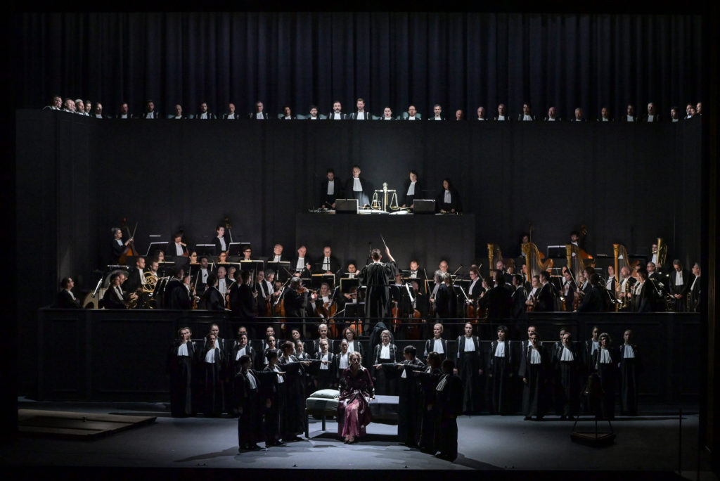 Ce geste scénographique, prolongé dans la seconde partie par un retournement spectaculaire du dispositif, avait de quoi séduire. En effet, lorsque le rideau se rouvre après l'entracte, l'effet de surprise est réel : l'orchestre a quitté la fosse pour occuper le plateau, organisé comme un tribunal monumental. Les musiciens, tous vêtus de robes d'avocats noires et de jabots blancs, deviennent les officiants d'un procès métaphysique aux atours kafkaïens nous dit Silvia Costa dans le programme de salle. La fosse désormais vide se transforme en zone d'ombre, difficilement lisible d'ailleurs, où Faust lutte avec des pupitres comme armes dérisoires pour exorciser les démons, comme si la musique devait elle-même servir d'arme défensive contre le monde extérieur. Le chef, vu de dos, semble convoqué à la barre des témoins, tandis que les plateaux déséquilibrés de la balance qui trône au centre, accompagnent visuellement la dimension diabolique de ce "jugement", avec trois percussionnistes abattant leurs mailloches tels les marteaux des juges suprêmes. Les chœurs, eux aussi en robes judiciaires, se répartissent en deux masses : les femmes au proscenium auprès des solistes, les hommes en hauteur comme une assemblée sévère observant depuis une tribune. Les éclairages expressionnistes, saisissant les visages par en dessous, accentuent l'impression d'un rituel inquiétant, d'un théâtre du verdict plus que de la tentation. Ici, la démarche de Costa prend sens : replacer la musique au centre du jeu, la hisser au rang de personnage principal, avec Faust comme témoin perdu, et Méphistophélès comme maître de la machination.