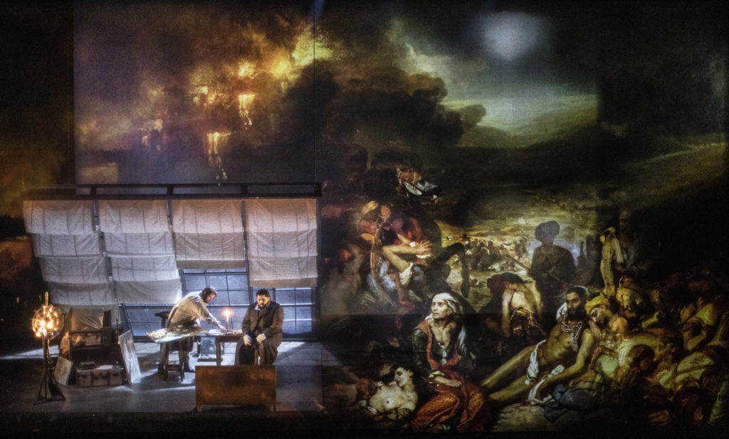 Dans l'acte I, l'espace scénique est comprimé à jardin et dominé par une verrière amovible figurant la soupente misérable des artistes. Les projections occupent la droite de la scène, convoquant Les Massacres de Scio de Delacroix, contrepoint tragique aux premiers élans amoureux. Tout semble dire que tandis que Rodolfo et Mimì se découvrent, le monde, ailleurs, se défait dans la violence. Lorsque Mimì évoque sa chandelle éteinte et demande qu'on rallume sa bougie, elle se redresse, et la lumière jaillit d'une étrange parabole métallique, immense photophore/métaphore qui évoque, sans lourdeur, une statue de la Liberté contemporaine. Mimì devient alors, scéniquement, l'incarnation fragile d'un appel à la liberté — liberté d'aimer, de vivre, d'exister dans un monde contraint. La correspondance visuelle entre la petite lampe posée sur la table et sa réplique monumentale suspendue dans l'espace renforce cette symbolique sans jamais la figer, tandis qu'apparaît en fond, l'ombre estompée de la Jeune fille à mi-corps de Jean-Jacques Henner.