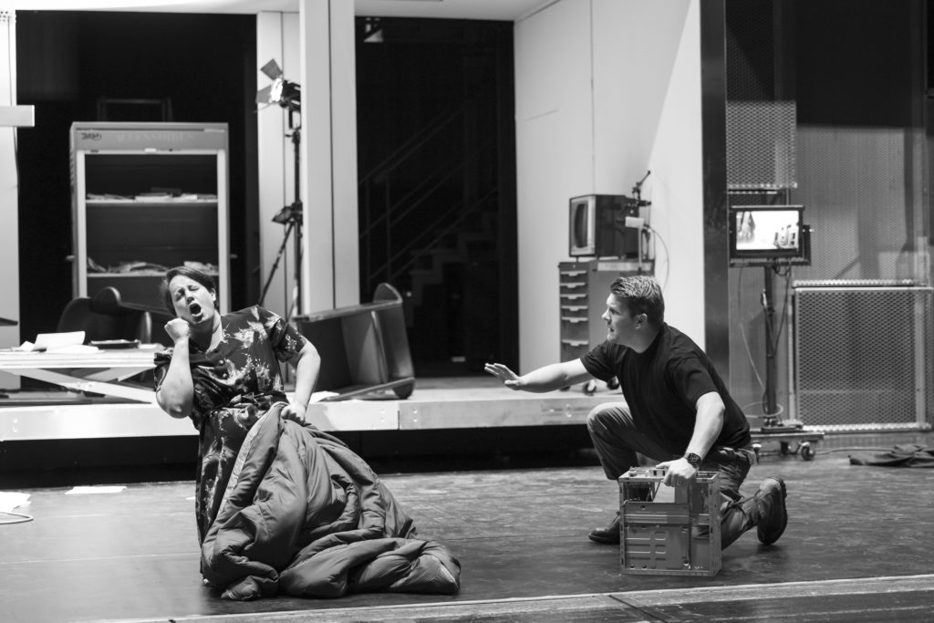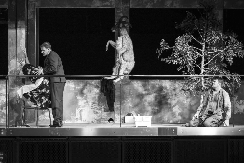 La direction d'acteurs suit la même ambivalence. Bieito opte pour une expressivité accentuée, un théâtre de gestes exacerbés où la psychologie semble moins travaillée que soulignée. On pense à la scène où Sieglinde, dans un mouvement quasi chorégraphié, se retourne un couteau à la main tandis que Hunding la lutine lourdement, dans une sorte de pantomime conjugale maladroite qui rappelle conjointement Tosca et le théâtre de boulevard avec l'amant, le mari et la femme. La proximité forcée entre les personnages, exacerbée par le cadre étroit du salon, devrait idéalement conduire à un resserrement de la tension ; au contraire, l'espace semble étrangement poreux, comme si aucun geste n'avait la force d'imposer une intensité durable.