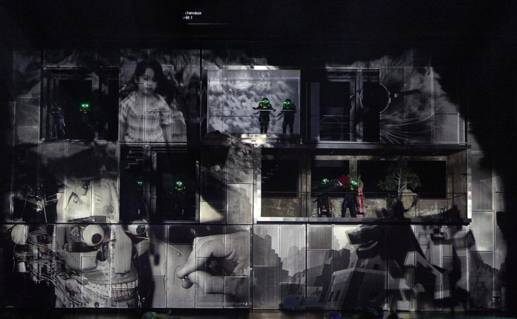 L'arrivée de Siegmund renforce l'idée d'un monde extérieur contaminé où l'air lui-même est devenu danger. Le héros apparaît équipé d'un masque à gaz, de lunettes de protection, d'un réservoir d'oxygène sur le dos, comme un rescapé fuyant un hiver nucléaire ou un accident chimique. Tous ces signes, filmés et rediffusés en très gros plans sur la surface entière du décor, créent un premier vertige : l'action n'est plus seulement visible, elle est surveillée. Sarah Derendinger a imaginé un système de caméras disséminées dans la cage captent les gestes, les fragments de visage, les réactions, et les projettent en direct sur cette façade métallique. La scène vécue par les chanteurs s'inscrit alors dans une image vidéo à échelle démesurée – une image qui la surplombe, la double, l'encadre. L'idée pourrait être remarquable : ce jeu constamment rejoué entre le réel et sa traduction technologique souligne l'état de siège, la paranoïa, le sentiment d'être observé dans la moindre respiration. Mais l'utilisation systématique du procédé l'épuise rapidement. À force de voir l'action redoublée en permanence, on ne distingue plus ce qui devrait être intime de ce qui appartient à l'univers du contrôle. La tension que crée cet effet de surveillance constante finit par se dissoudre dans une répétition mécanique qui apaise au lieu d'opprimer.