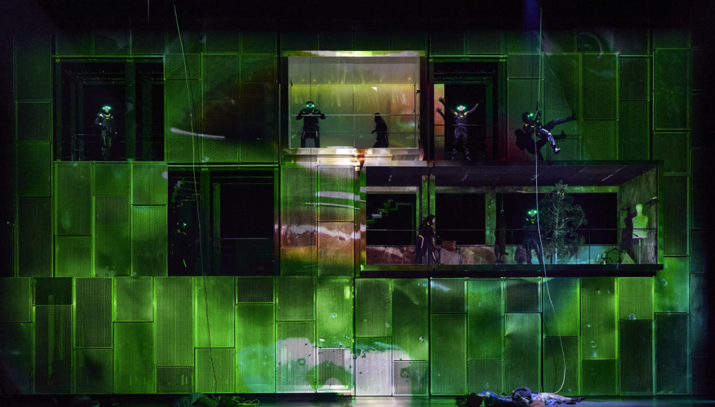 Ce premier acte donne d'emblée la mesure d'un imaginaire en forme de signature esthétique : un espace clos, saturé de signes, dominé par cette haute et vaste cage métallique conçue par la fidèle Rebecca Ringst qui occupe tout le plateau, segmentée en cellules et parements de tôles perforées. Un décor qui n'a rien de neutre mais qui constitue une architecture contraignante, presque carcérale. Elle évoque, par sa verticalité et ses compartiments, une façade de Walhalla aux allures de prison numérique qui renvoie à l'univers des espaces de stockage de Big Datas. Au cœur de cette structure monumentale, le logis (ou plutôt le "salon") de Hunding – plus étroit que misérable – semble littéralement comprimé : un intérieur trop petit pour le contenant qui l'entoure. L'impression immédiate n'est pas celle d'un foyer mais celle d'une pièce de survie qui rappelle les images des immeubles ukrainiens survivant aux bombardements, avec des rideaux en lambeaux qui suggèrent une violence venue de l'extérieur qui contraint les personnages à rester confinés.