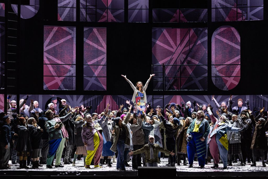 La première conséquence en est un maniement des groupes, des foules et des personnages d’une grande virtuosité, on oserait presque dire « as usual » tant Kosky sait manier les groupes dans un espace réduit (souvenons-nous nous de son acte I des Meistersinger von Nürnberg à Bayreuth), mais cette fois, il utilise tout l’espace, dans son horizontalité et sa verticalité, ça marche, ça tourne, ça virevolte mais ça voltige aussi.