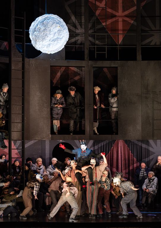 C’est une histoire villageoise un peu leste, un peu naïve, un gentil pacte avec un Diable pas si méchant qui n’a rien à voir avec Mephisto, un Diable de campagne qui s’ennuie et qui ne fait pas trop de mal, mais c’est aussi un Noël un peu païen avec les références permanentes notamment chorales à Kolyada, qui est la déesse du Soleil, fêtée le 24 décembre, pour le solstice, assise sur un traineau et allant de maison en maison. Nous sommes donc selon Kosky dans un Kosmos villageois, d’où un décor fermé de Klaus Grünberg, un village ukrainien qui tient aussi par son fonctionnement centripète du Shtetl juif, où circulent des traditions à la fois religieuses et païennes, avec un fort sentiment de la nature, un authentique paganisme slave qu’on retrouvera aussi un peu plus tard dans le Sacre du Printemps de Stravinski, réveil de la nature qui nous rappelle aussi que Kolyada est aussi déesse du printemps.