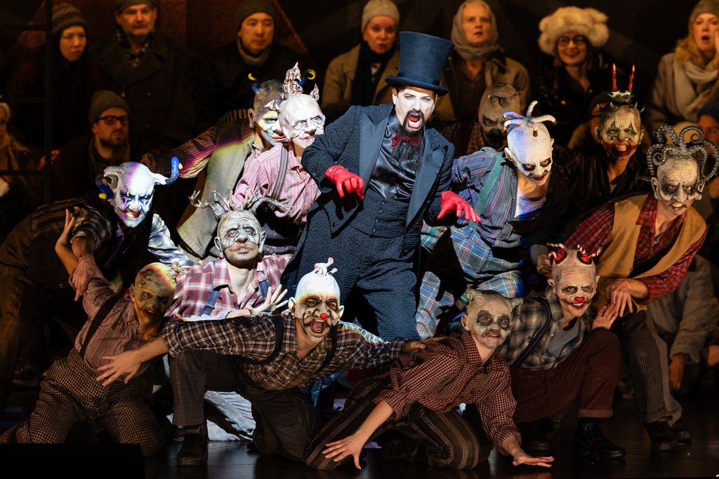 En montrant ce petit peuple au costumes sombres et pauvres vivre, jouir, rire, et chanter Kolyada ou Noël – et ces chants loin de ralentir l’action, lui donnent tout son poids et sa valence « Komique »/de κῶμος , sa valeur de comédie aristophanesque, c’est-à-dire en quelque sorte d’UR-Comédie, de comédie des origines – Kosky fait de ce conte de Noël quelque chose de bien plus profond, en essayant de plonger dans les racines culturelles de nos cultures, depuis les siècles des siècles. Dans ce chaudron bout notre histoire, et pour une fois c’est une histoire souriante, apaisée, au pôle opposé de toute tragédie. Il y a dans ce parti-pris une volonté de saisir une sorte de rousseauisme originel, dans une petite société qui vit avec ses fantômes et ses figures, une petite terre du bonheur.