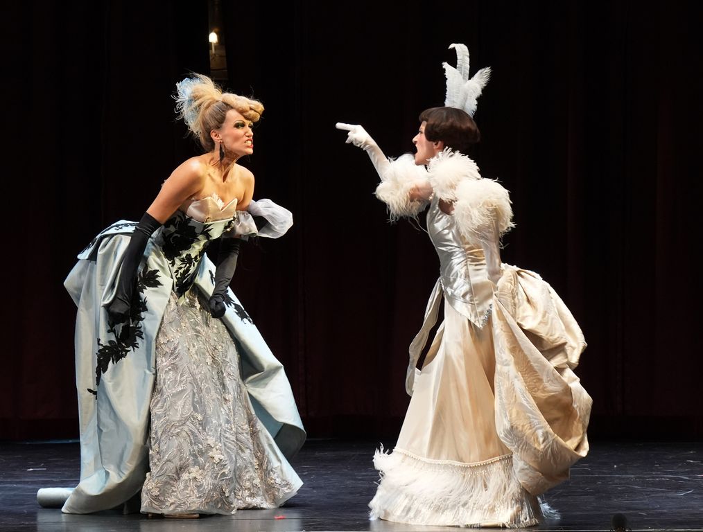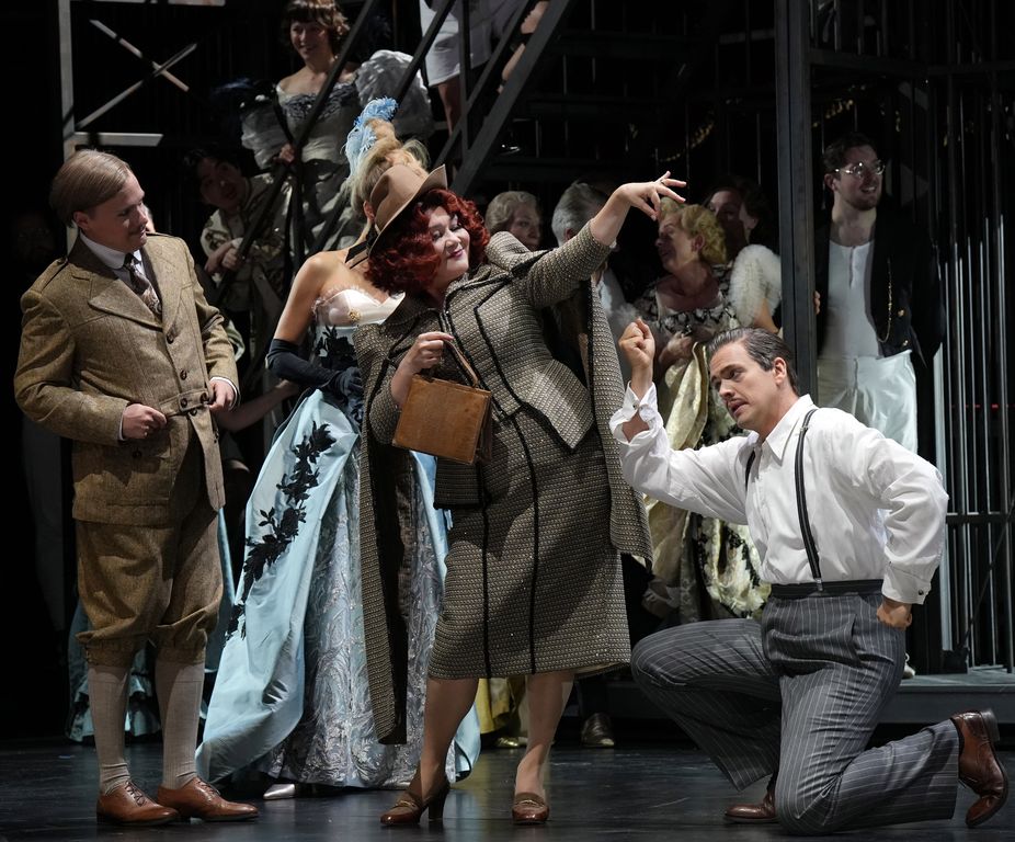 Rosalinde est Hulkar Sabirova. Jusqu'à présent, nous avions rencontré cette soprano, née en Ouzbékistan et de nationalité allemande, dans des rôles très exigeants, qui la conduisent peut-être à la limite même (et un peu au-delà) de ses possibilités, comme celui d'Hélène dans Les Vêpres siciliennes au Deutsche Oper de Berlin, ou celui de Leonora dans La forza del destino à l'Opéra de Lyon. Le rôle de Rosalinde n'a peut-être pas la même difficulté en termes strictement vocaux, en plus d'être fondamentalement opposé à ceux cités en termes dramatiques. Ici, Sabirova se consacre avec une générosité totale à l'interprétation d'un personnage que Herheim imagine comme vivant en permanence, ou feignant de recréer, le monde des passions débridées des icônes de l'opéra. Avec un enthousiasme contagieux, une franchise communicative, une énergie qui déjoue et annule toute résistance éventuelle, Sabirova n'est probablement pas la Rosalinde la plus raffinée, la plus subtile ou la plus sexy, mais elle ne prétend pas l’être non plus. Au contraire, elle s'intègre dans le mécanisme de la production comme l'une de ses images iconiques, d'une part la chanteuse à la retraite, épouse du riche Eisenstein, qui cherche un ténor-amant alpha pour divertir son ennui, et d'autre part la figure rappelée par Frosch / Franz Joseph de sa Sissi adorée, qui se superpose à son tour à la beauté hongroise inconnue qui fait irruption à la fête d'Orlofsky.