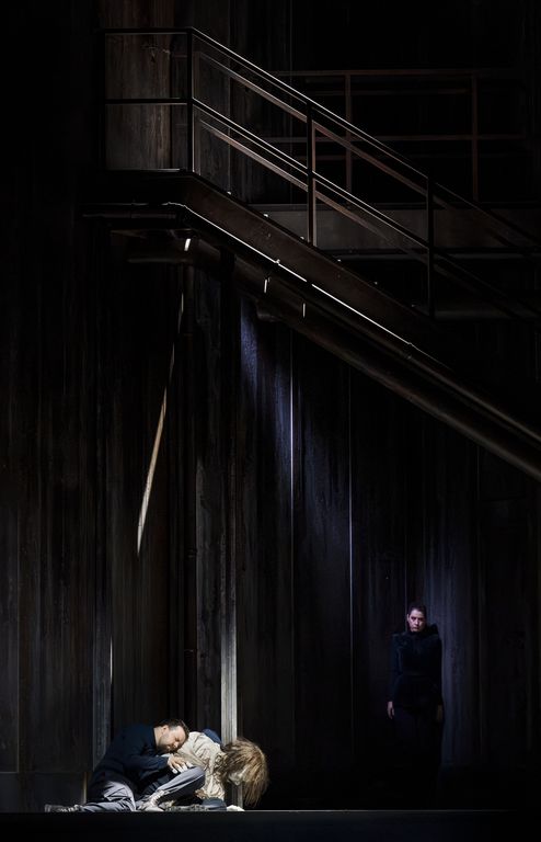 Le décor assez impressionnant et gris de Julius Theodor Semmelmann est un mur qui se perce de temps à autres de scènes inscrites dans une niche : c’est la présence écrasante de la prison qui est ici soulignée, et qui écrase tous les personnages qui s’y inscrivent. Ce mur s’ouvre un peu sur la Lumière au deuxième acte, mais même – et c’est un peu paradoxal – le cachot de Florestan paraît presque plus aéré que le mur du premier acte, le tout souligné par les lumières assez soignées de Franz Tscheck.