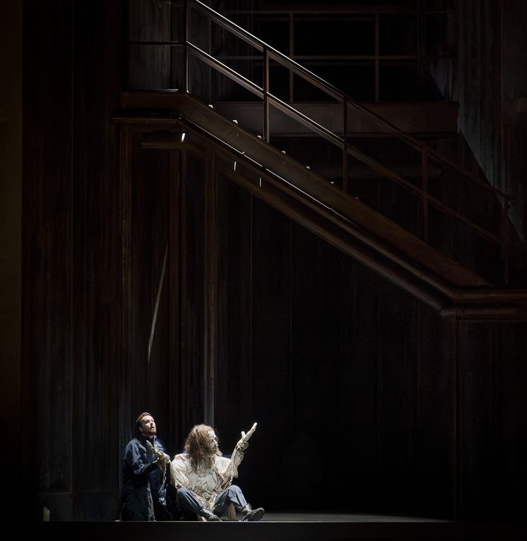 Au deuxième acte la même cause produit le même effet avec Florestan qui chante d’un côté le chanteur son air impossible (« Gott »), et de l’autre une marionnette écroulée à l’allure vaguement bestiale (un Jochanaan oublié…) dans un coin sombre.