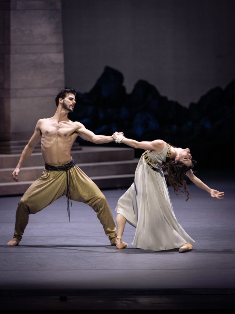 Chéréas est un personnage ambivalent : jaloux et brutal, mais aussi sincèrement amoureux, ce qui autorise différents angles d’interprétation. Alessandro Frola, artiste majuscule du Ballet de Hambourg où il a réinventé nombre de rôles de John Neumeier – et dont il reste invité permanent –, avait lors de l’entrée au répertoire interprété Dionysos et fait là ses débuts en Chéréas, dont il creuse admirablement le côté gaillard, un peu naïf, presque tendre, une sorte de Colas sicilien. Ce qui frappe, c’est sa manière unique d’habiter les silences, les temps suspendus, dans les scènes de tendresse et d’adage avec Callirhoé. Il se fond dans vocabulaire résolument classique, mais jamais muséifié, de Ratmansky, et offrent des sauts nets, des lignes précises puis, dans l’acte II, impose une lecture expansive, physique, presqu’animale dans le grand manège. Il trouve là un rôle lui permettant de pleinement déployer sa renversante versatilité interprétative. Il met parfaitement en confiance et en valeur la jeune soliste brésilienne Sinthia Liz, qui faisait ce soir-là des débuts retardés par une blessure. Elle n’a évidemment pas l’expérience ni l’évidence de Mlle Trenary mais apporte au personnage quelque chose de plus vulnérable, de plus immédiatement émotionnel, jouant davantage sur les contrastes et la fragilité.