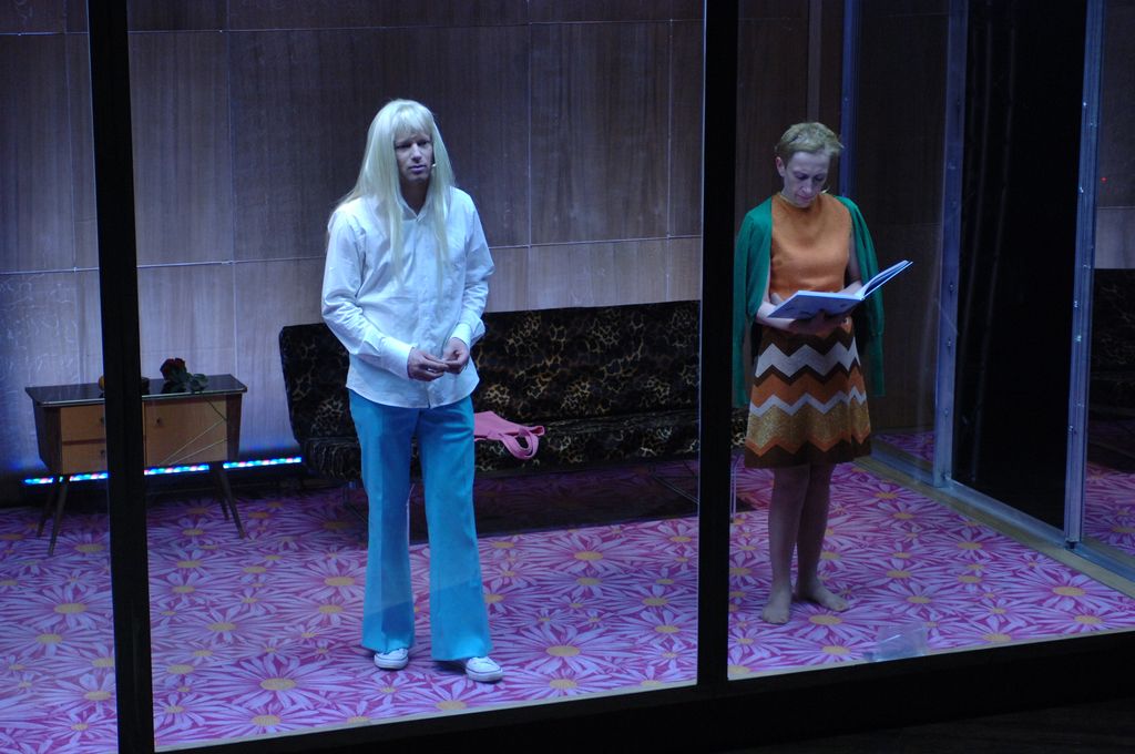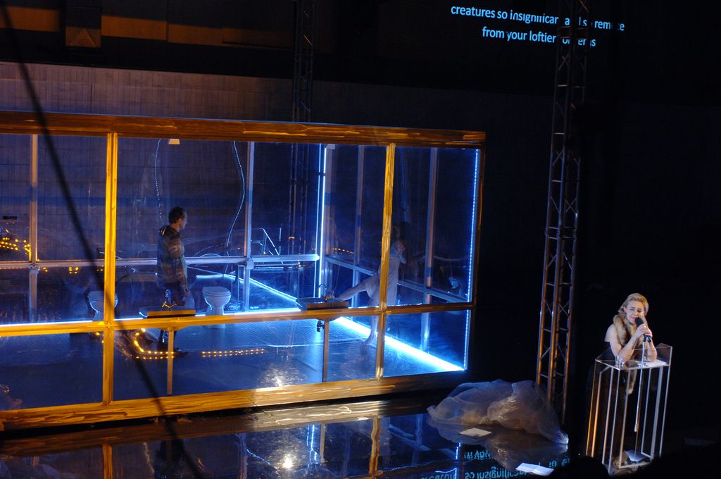 Quand le spectateur s’installe, il s‘installe dans un univers familier, des espaces clos de plexiglas, un long banc à droite, à cour, et sur ce banc trois mannequins de cellulose (photo), eux aussi familiers (ils rappellent ceux qu’on a vus dans Tristan et Isolde au troisième acte quand Warlikowski évoquait Tristan orphelin dans un orphelinat imaginaire.)
