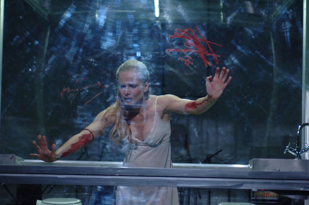 et Alceste alors jusque-là calme ou faisant comme si s’échappe, pour ne pas subir de mort clinique et propre, mais destructrice et « sale », se couvrant de sang, dessinant dans sa cage de plexiglas où elle s‘est réfugiée maison et enfants, ce qu’elle laisse, se détruisant elle-même (dans la légende, elle s’empoisonne), pour ne pas à être détruite proprement. La mort dans les conditions imposées ainsi est sale, est horreur, est à l’opposé de ce pourquoi elle meurt.