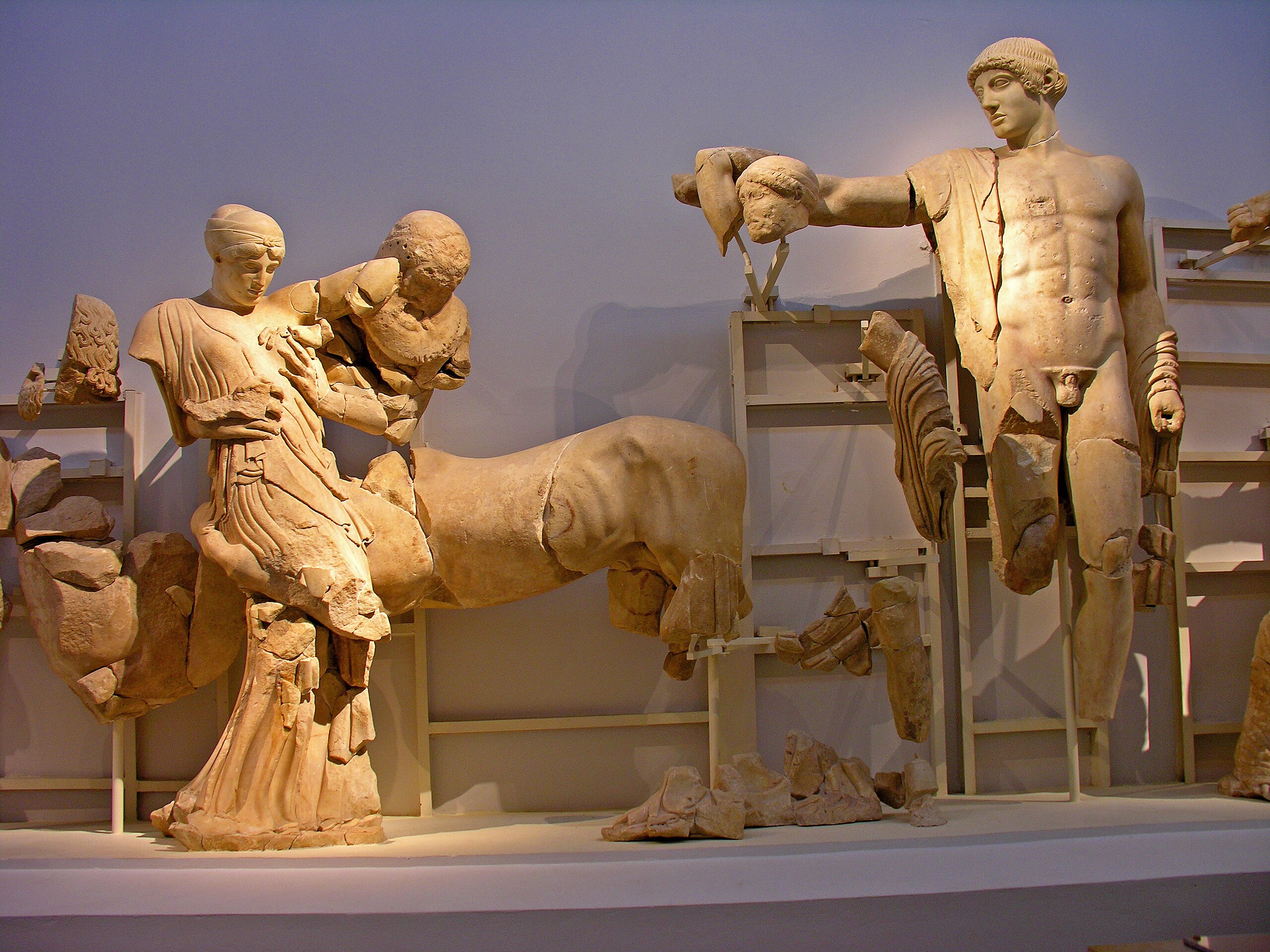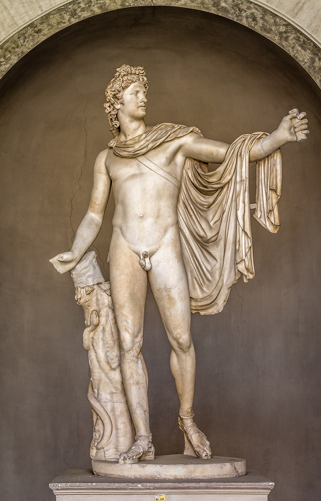 Cet Apollon habillé en homme de ménage a terminé sa mission auprès d’Admète, il peut redevenir Dieu et un Dieu, en bonne statuaire grecque, c’est nu. Il se met donc nu et sur son corps, au lieu de la peau lisse d’un marbre éternel, appararaissent des « tatouages »