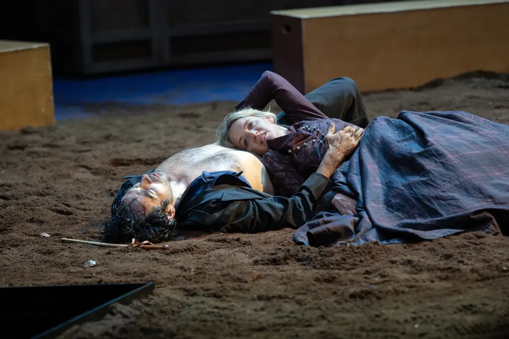 Bravant le froid hivernal à Lyon, le public s’est déplacé en ce samedi soir et s’installe rapidement dans la Grande Salle pour la quatrième représentation de Bovary Madame. Au parterre, on entend plusieurs conversations : les spectateurs ne dissimulent pas leur enthousiasme de découvrir la dernière mise en scène de Christophe Honoré. Et dès que le rideau se lève, la salle plongée dans le noir semble captivée. Le spectacle s’ouvre sur l’entrée des comédiens et on est immédiatement frappé par la conception à la fois ingénieuse et esthétique de la scénographie cachée à la vue du public jusque-là : un sol de terre battue, un singulier dispositif ouvert sur la salle figurant le chapiteau d’un cirque avec à jardin, des gradins en hauteur par rapport au plateau-piste, et à cour, un balcon comme une sorte d’upper stage rappelant presque le théâtre élisabéthain.