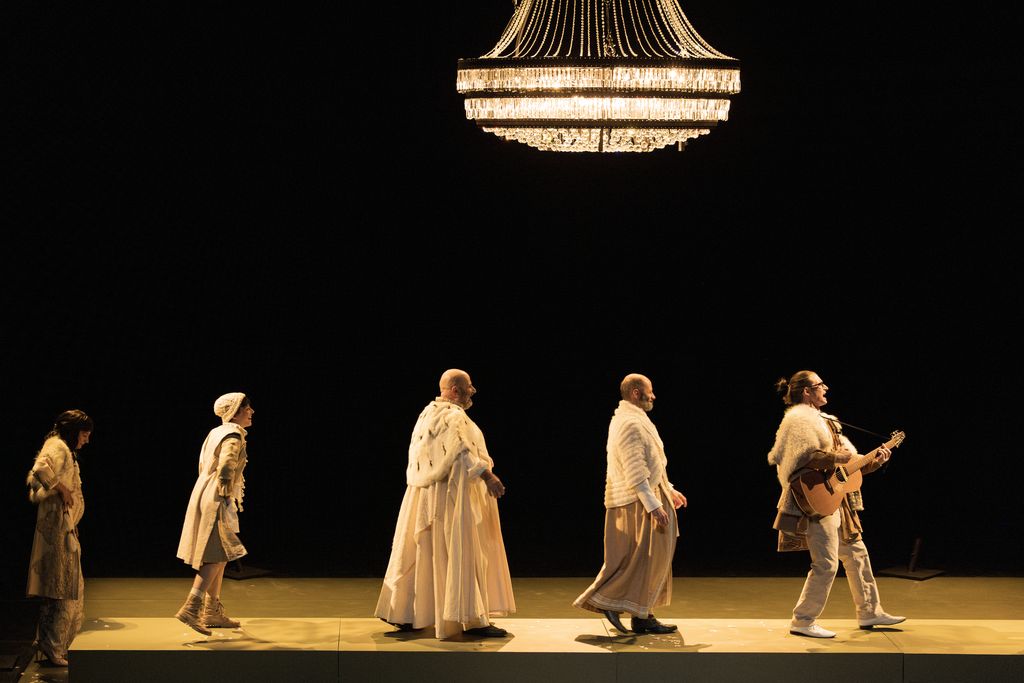Les costumes commencent par respecter la donnée à la fois royale et hivernale des premiers actes : capes d’hermine et fourrures pour Polyxène, Léonte et Hermione, dont les personnages se dépouillent peu à peu, à mesure que leur âme est mise à nu. Pour les paysans de Bohême, les vêtements se rapprochent de notre époque, avec casquettes et bonnets ; c’est d’autant plus nécessaire qu’une vingtaine de spectateurs, préalablement inscrits, rejoignent en tenue de ville les acteurs sur le plateau afin de rendre plus festive la scène de réjouissances que vient troubler le roi Polyxène. Ce moment participatif est tout à fait réussi, par l’habileté avec laquelle il intègre des non-professionnels à la troupe, et il permet aussi d’intégrer à la représentation un certain nombre de chansons élisabéthaines revues par Nikola Takov et accompagnées à l’accordéon et à la harpe par Nina Petit.