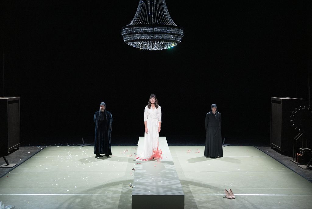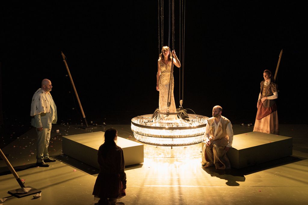 Les contrastes entre ces différentes incarnations sont encore accentués par les choix de la mise en scène, qui oppose très nettement la première partie du spectacle, qui se déroule en Sicile, à la deuxième, située en Bohême. Le décor, réduit à l’essentiel, se compose essentiellement d’une sorte de longue estrade, qui peut se découper en quatre éléments, sous un énorme lustre en cristal – non pas de Bohême, mais plutôt de Sicile. Pourtant, s’il semble symboliser d’abord le faste de la cour du roi Léonte, il continue d’occuper le centre de la scène jusqu’à la fin de la représentation, même quand l’action se transporte parmi les « rustiques », où sa présence pourrait sembler plus étonnante. A moins qu’il ne renvoie à la convention du théâtre élisabéthain, au décor quasi unique où le public était invité à reconnaître divers lieux successifs en usant de son imagination. Ce lustre, qui se baisse et se relève, auquel on accroche des guirlandes pour la fête de la tonte des moutons, et qui servira de socle à la « statue » d’Hermione, n’est finalement qu’un soleil qui éclaire tous les humains quelle que soit leur condition, dans cette histoire où les princes se déguisent en bergers et où les bergères se révèlent être des princesses.