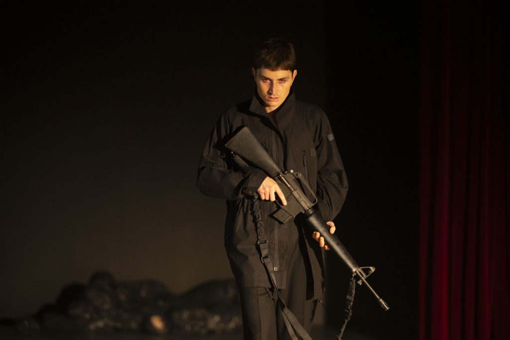 Plus violent dans les faits : le départ de Laertes en soldat bien équipé, treillis/M16 (arme états-unienne, obligatoire au sein de l’OTAN) avec un père mal remis de la noce-fête de départ, fier d’envoyer son fils défendre la patrie, l’honneur, la famille etc. mais ici, la scène résonne comme l’envoi une bête à l’abattoir pour continuer le festin (toute référence à des évènements politiques récents n’est que purement fortuite..). Car quel honneur derrière une mitraillette ? Et Polonius passe de la fierté aux larmes, à l’angoisse… à la descente d’alcool triste. Reste que le programme générationnel fonctionne : aux pères, les « dividendes de la paix », aux fils, la guerre en héritage…