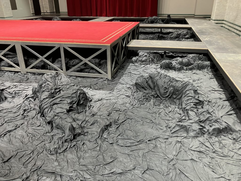 De l’autre côté, la scène de théâtre à rideau a été le théâtre de la noyade d’Ophélie : son suicide avec fusil mitrailleur. Elle est évacuée comme un élément du décor, sans ménagement comme un paquet de linge sale, par les domestiques.