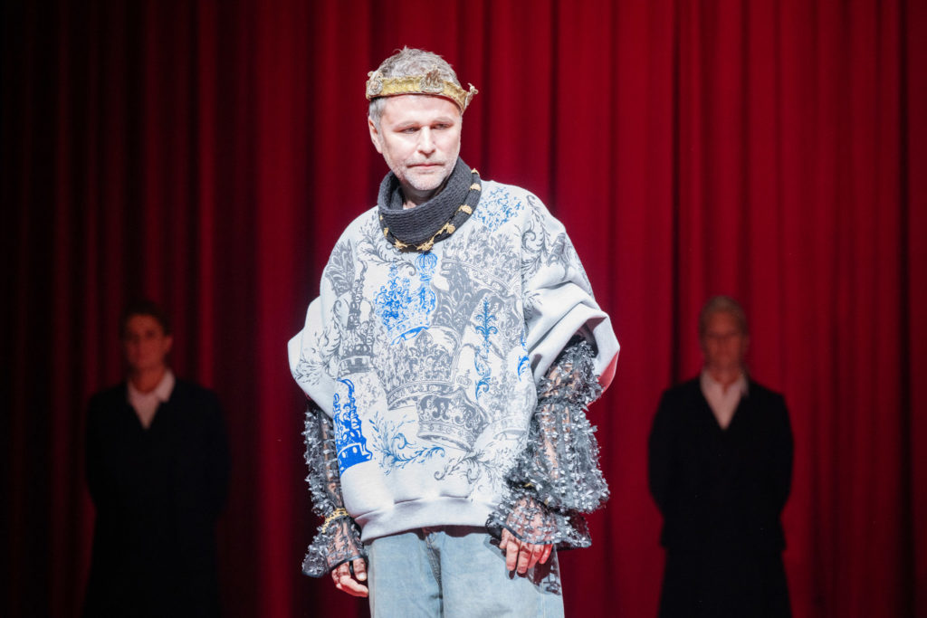 Le royaume de Danemark, c’est donc le nôtre ou plutôt celui de l’éternel boomer, abonné des scènes (il était déjà, dans un autre avatar, le Roi Lear de Dramaten en 2024)… éternel ado jouisseur en baggy et sweat-shirt oversize, hip hop un jour, hip hop toujours. La couronne, bandeau doré miteux, branlante sur la tête. Jouisseur « quoiqu’il en coûte » comme on dit par chez nous[1]. Et dont les crimes ne seront jamais ouvertement révélés mais sentis (d’ailleurs, pas besoin de dire le crime : on connait la pièce…) comme un lourd poids, plutôt menaçant qu’encombrant (sauf dans le monologue de Claudius).