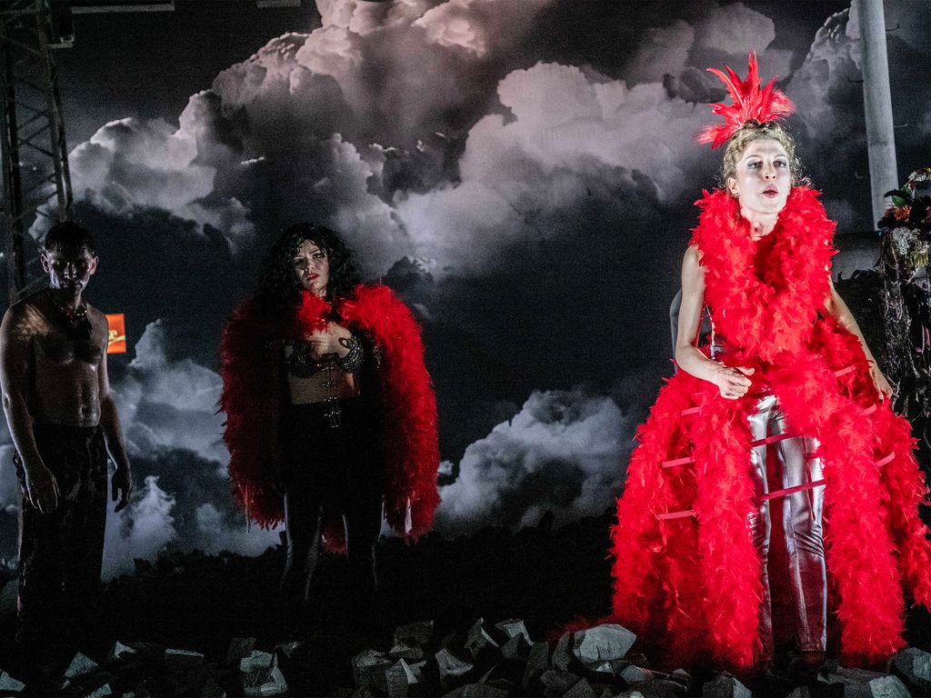 Sous les sublimes éclairages de Lothar Baumgarte, tendu entre un poteau électrique et un pylône, on devine sur fond de nuages menaçants le mot « Europe » à l’envers avec un E déjà presque tombé, comme une sorte d’entrée d’un Disneyland en ruines, dont il reste un bunker en béton et un amas de gravats de charbon dans lequel les acteurs vont se plonger avec délices comme dans une piscine d’hôtel 5 étoiles*****. La jouissance dans la ruine.